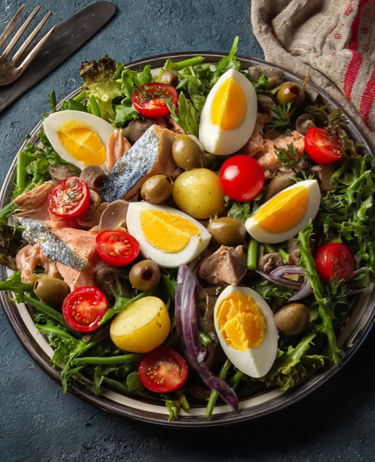This Salad Niçoise is a vibrant and colorful dish, with fresh greens, tender potatoes, crunchy green beans, and the salty bite of anchovies and Niçoise olives. Topped with hard-cooked eggs …